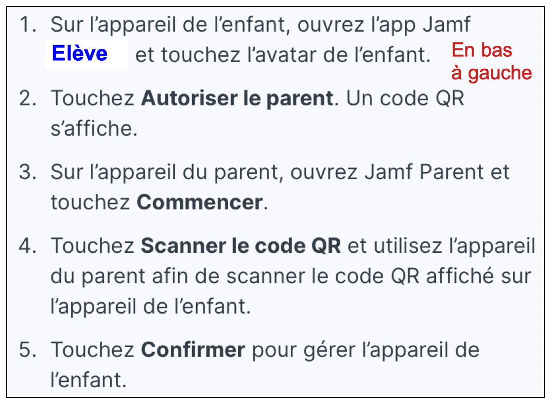 Pour cela, il suffit d’installer l’application gratuite Jamf Parent sur votre téléphone (iPhone ou Androïd) et de suivre les instructions suivantes : attention, à faire en dehors du temps scolaire (avant 8h ou après 18h)