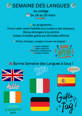 Participez à la semaine des Langues en décorant votre casier d'un drapeau, en goûtant de nouvelles saveurs à la cantine, en écoutant du bon rock anglais, en scannant les QR codes affichés et en portant les couleurs des drapeaux britannique, italien, allemand et espagnol!